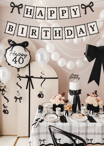 Baner Happy Birthday Kokardki w kolorze kremowo-czarnym o długości 100 cm. Produkt gotowy do użycia po wyjęciu z opakowania. Papierowy baner przeszyty czarnym sznurkiem.